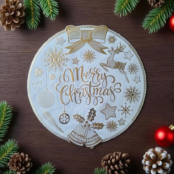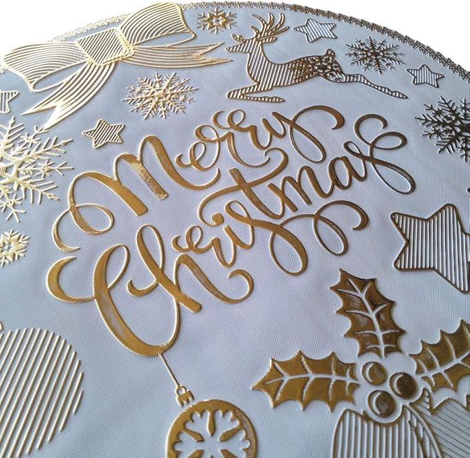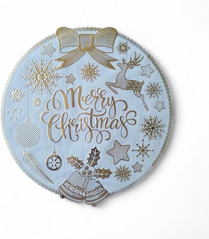 DESIGN ELEGANTE: Sottopiatto natalizio con decorazioni dorate su sfondo bianco, caratterizzato da un motivo festivo con fiocchi di neve, stelle e campane