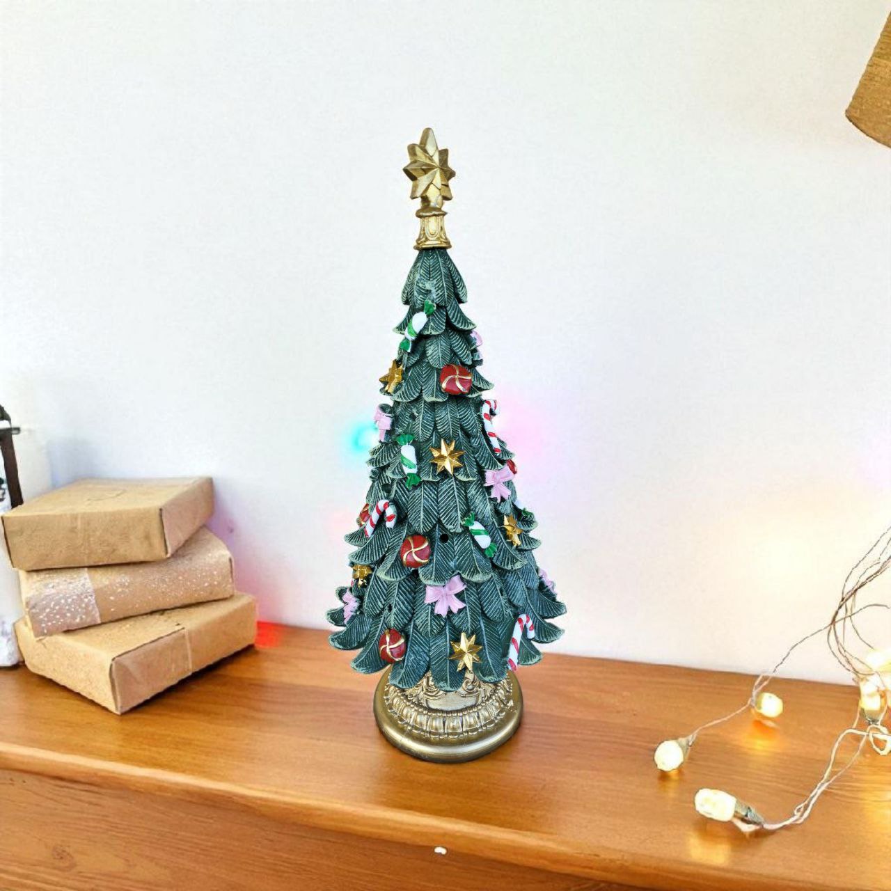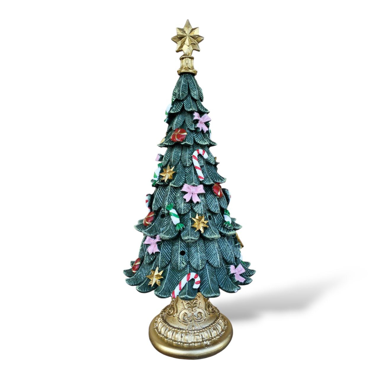 Albero di Natale Decorativo in Ceramica Verde con Base Dorata, Ornamenti Natalizi, Stelle e Bastoncini di Zucchero, Decorazione Festiva da Tavolo, 42×17 cm
