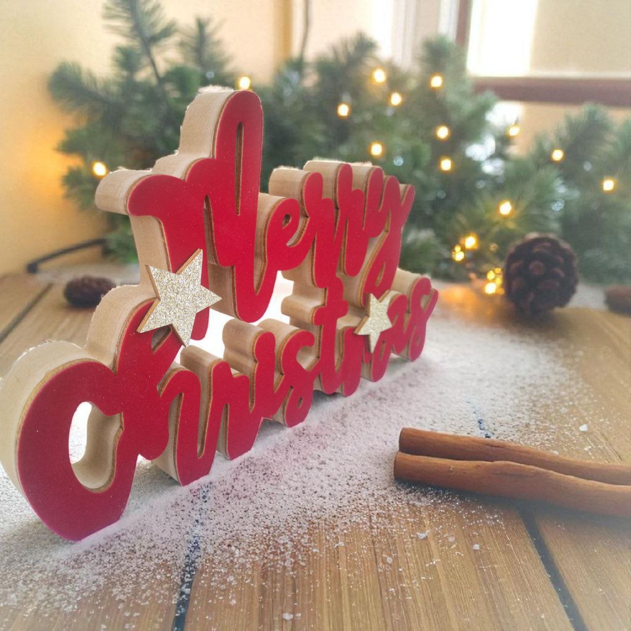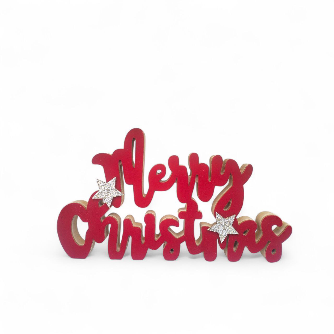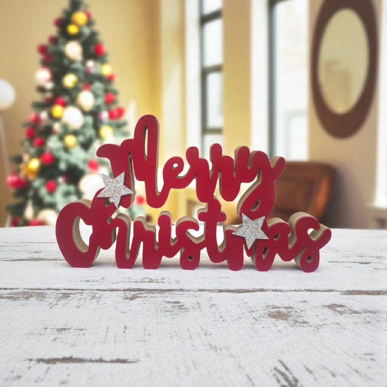Aggiungi un tocco di magia natalizia alla tua casa con questa elegante decorazione da tavolo ‘Merry Christmas’. Realizzata in legno di alta qualità, questa scritta decorativa in vellto si distingue per il suo vivace colore rosso e le scintillanti stelle argentate con finitura glitterata che ne impreziosiscono il design. La struttura tridimensionale conferisce profondità e carattere all’ornamento, rendendolo perfetto come centrotavola o come elemento decorativo per mensole e mobili. Le lettere cursive stilizzate creano un’atmosfera accogliente e festosa, mentre la base stabile assicura che la decorazione rimanga dritta e ben visibile. Un accessorio natalizio versatile che combina perfettamente l’eleganza classica con un tocco di modernità, ideale per arricchire l’atmosfera festiva della tua casa durante il periodo natalizio.